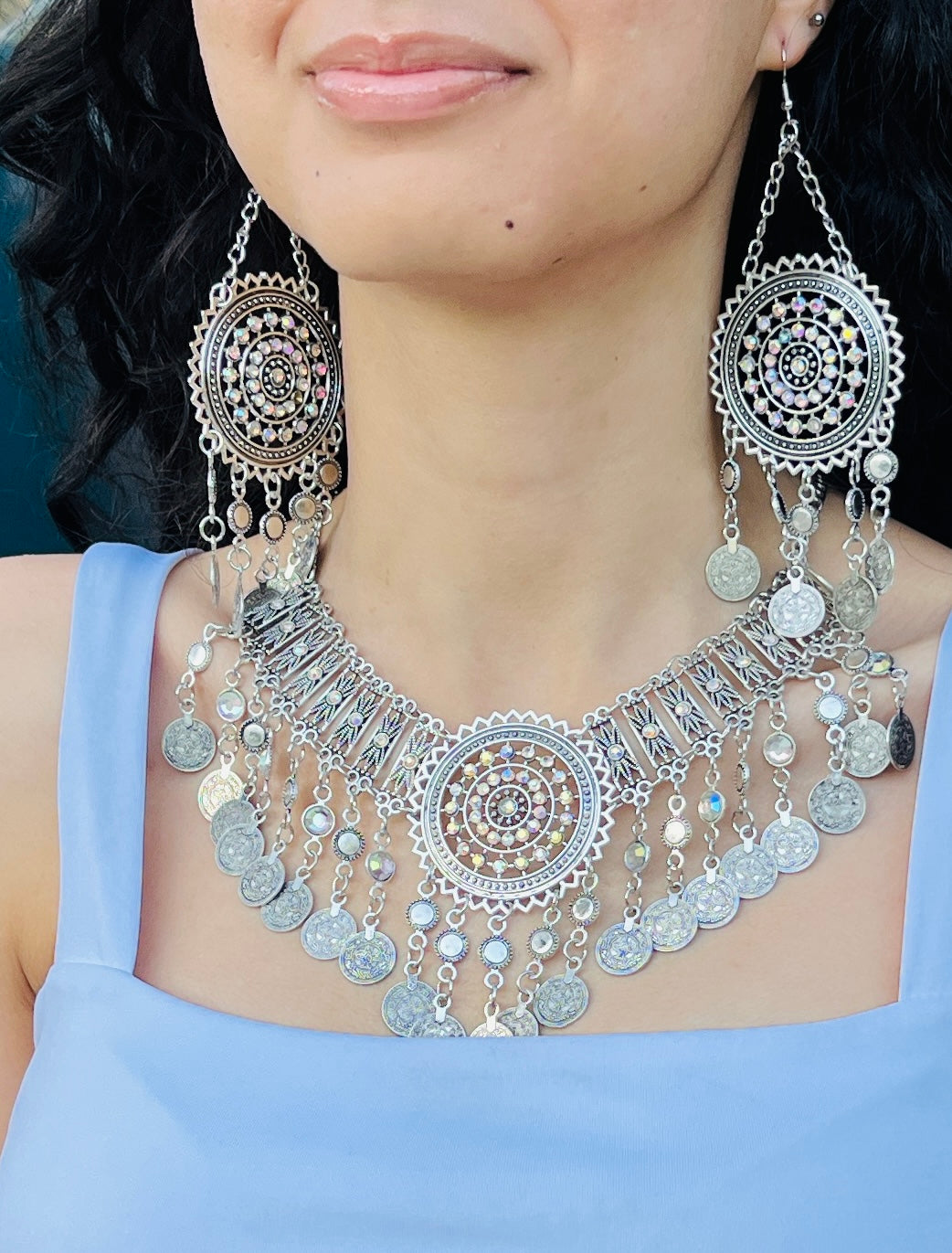 A stunning 4-piece Afghan jewelry set with a statement necklace, earrings, and headpiece. Decorated with traditional coins and shimmering stones, it’s perfect for cultural events, weddings, or adding a touch of heritage to your style.