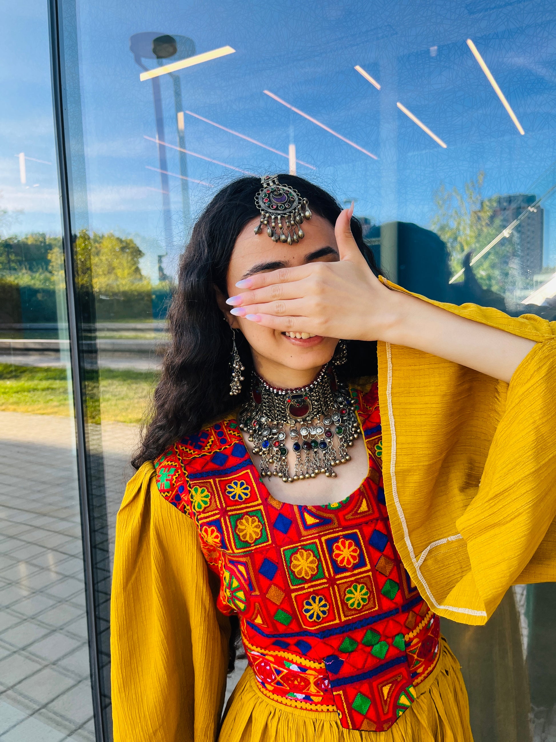 This is a handmade Kuchi choker set that comes with matching earrings and a matika (the headpiece). It’s colorful, vibrant, and totally eye-catching, with beautiful little coin charms and intricate handmade details that make it really stand out. Perfect if you want something unique and full of personality!