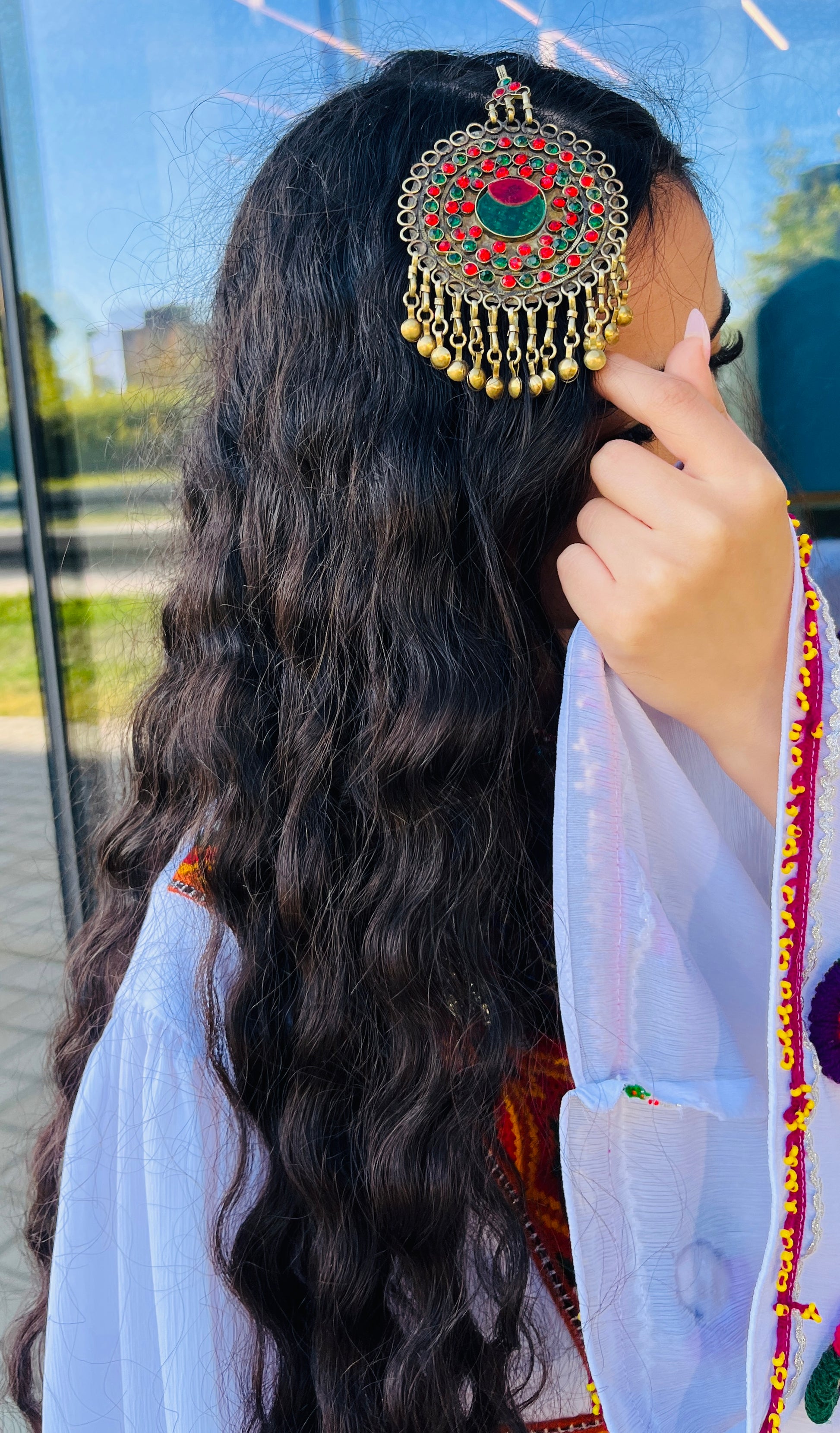 This handmade Afghan Kuchi choker set is crafted by skilled Afghan artisans and includes three pieces: a bold tribal choker necklace, matching earrings, and a traditional maang tikka (forehead pendant). Designed in a vintage-style with colorful glass inlays, detailed metalwork, and dangling charms.