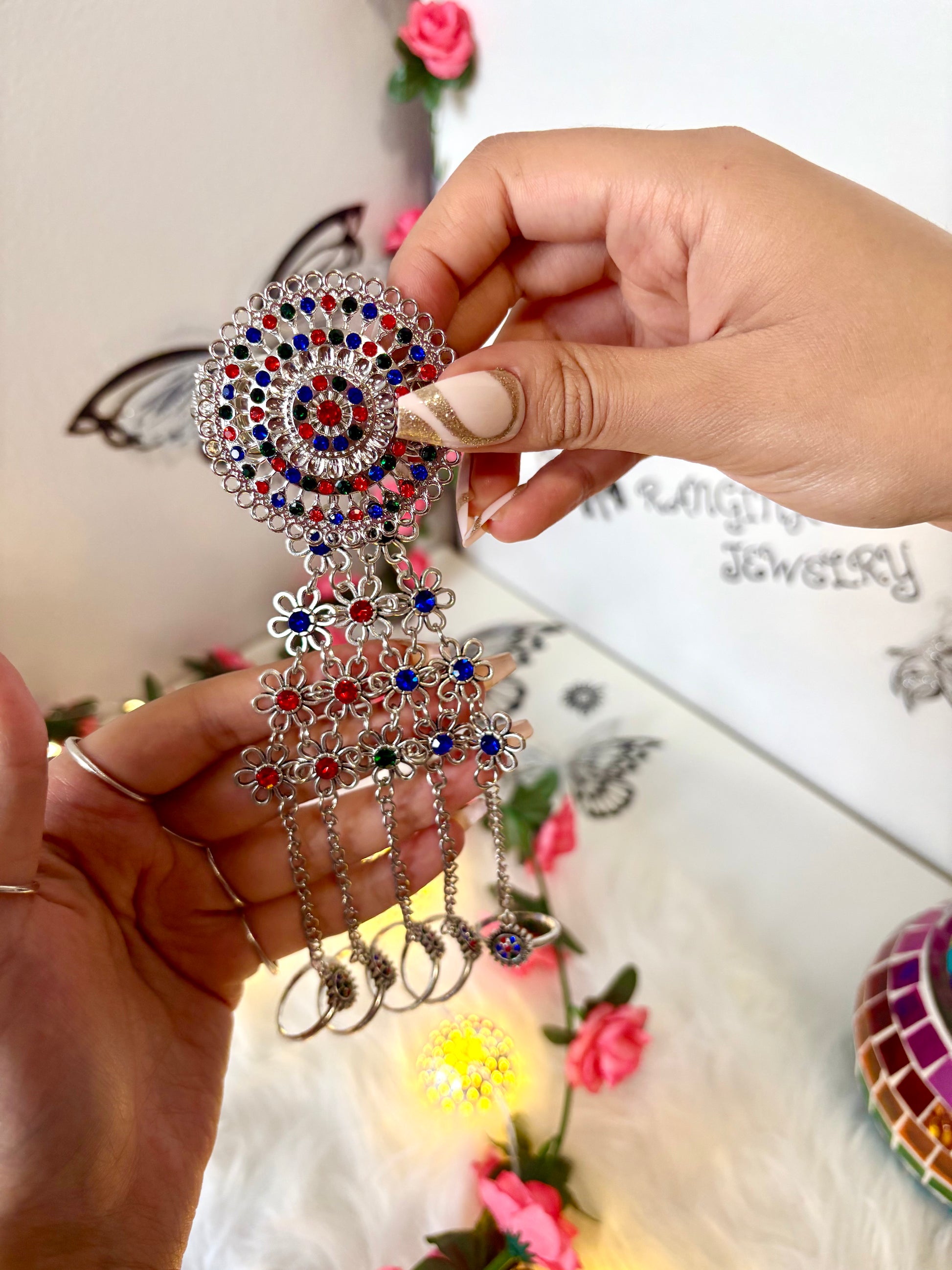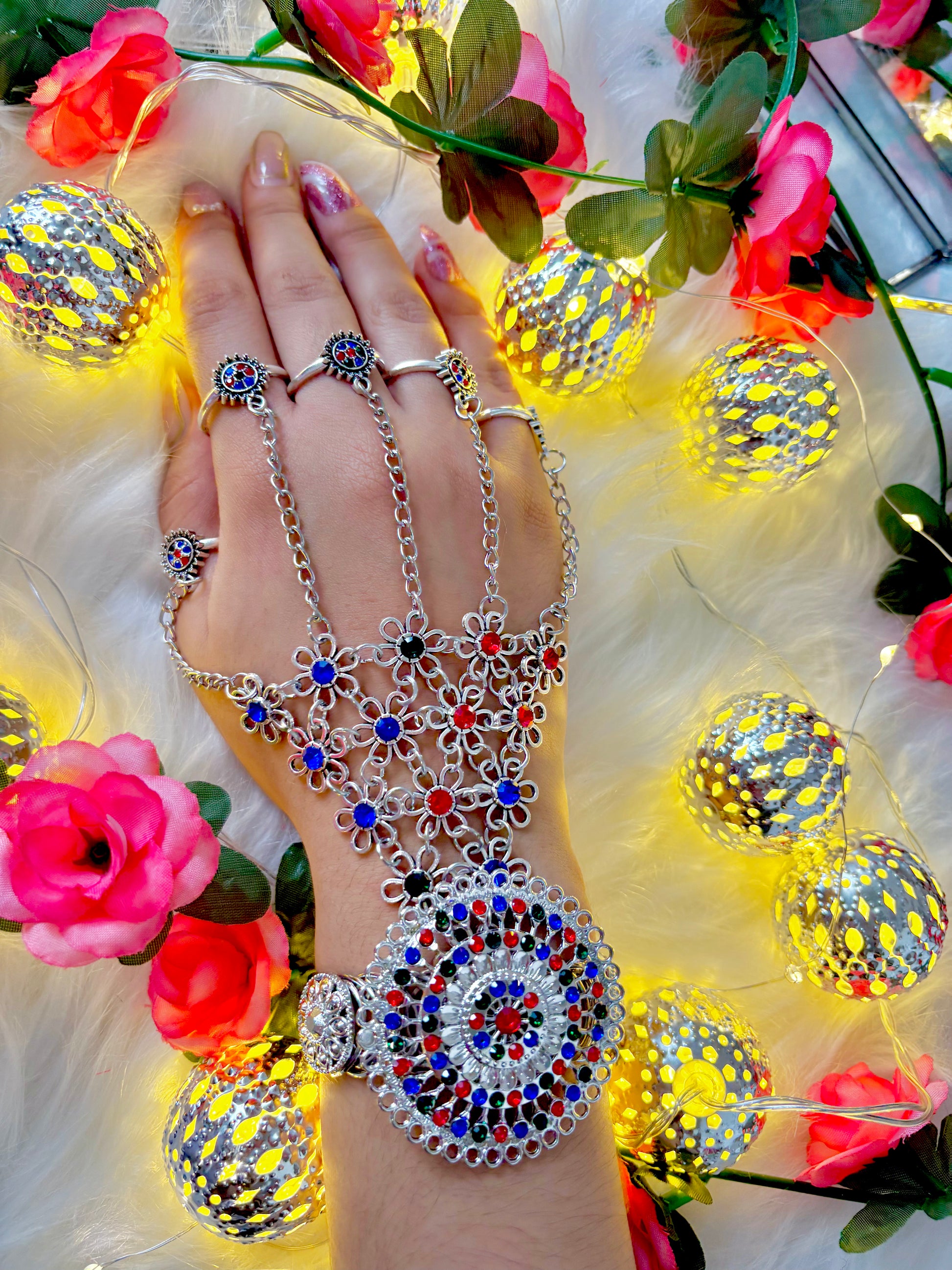 The Kuchi Hand Chain Bracelet is a handmade Afghan piece that connects five rings with a delicate, vibrant chain. Lightweight, adjustable, and beautifully crafted.